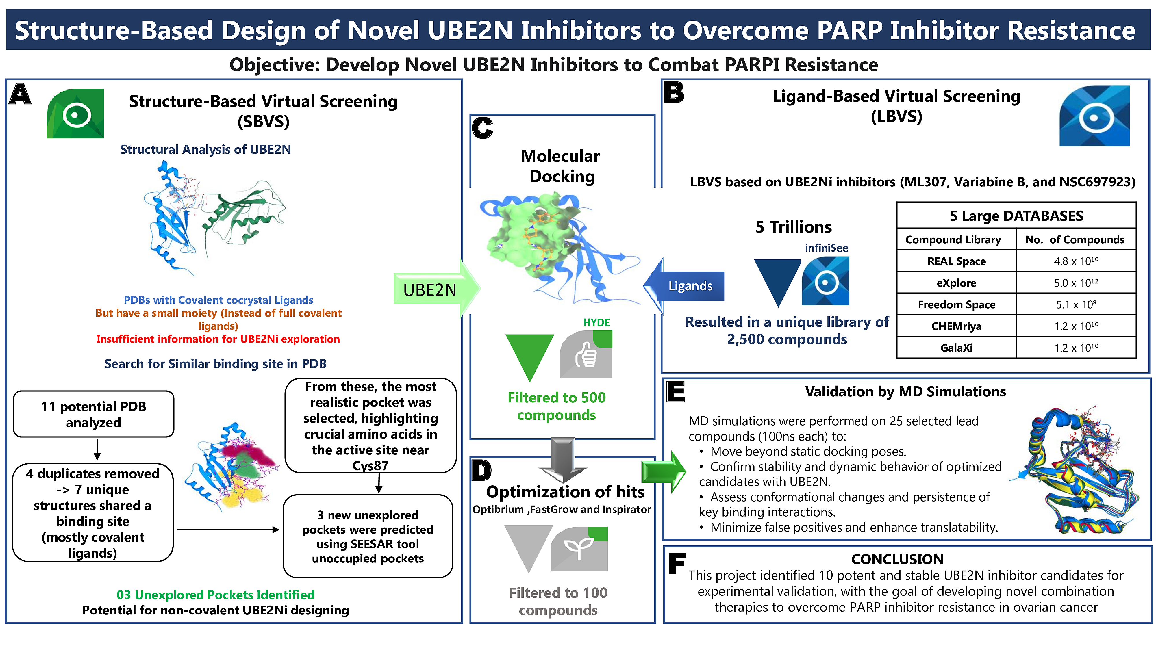 This report details a strategic Structure-Based Drug Design (SBDD) project focused on developing novel inhibitors of UBE2N to address the significant clinical challenge of PARP inhibitor (PARPi) resistance in ovarian cancer. The project utilizes an integrated computational workflow, including BioSolveIT's SeeSAR, InfiniSee, FastGrow and HYDE assessment for rapid virtual screening and interactive lead design, followed by Molecular Dynamics (MD) simulations for rigorous validation. The goal is to identify new non-covalent potentially and stable UBE2N inhibitors for subsequent cell-based testing, ultimately contributing to more effective combination therapies for ovarian cancer patients who have developed resistance to PARP inhibitors. The next planned...